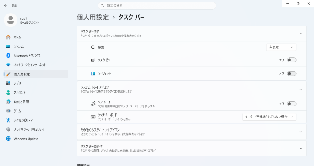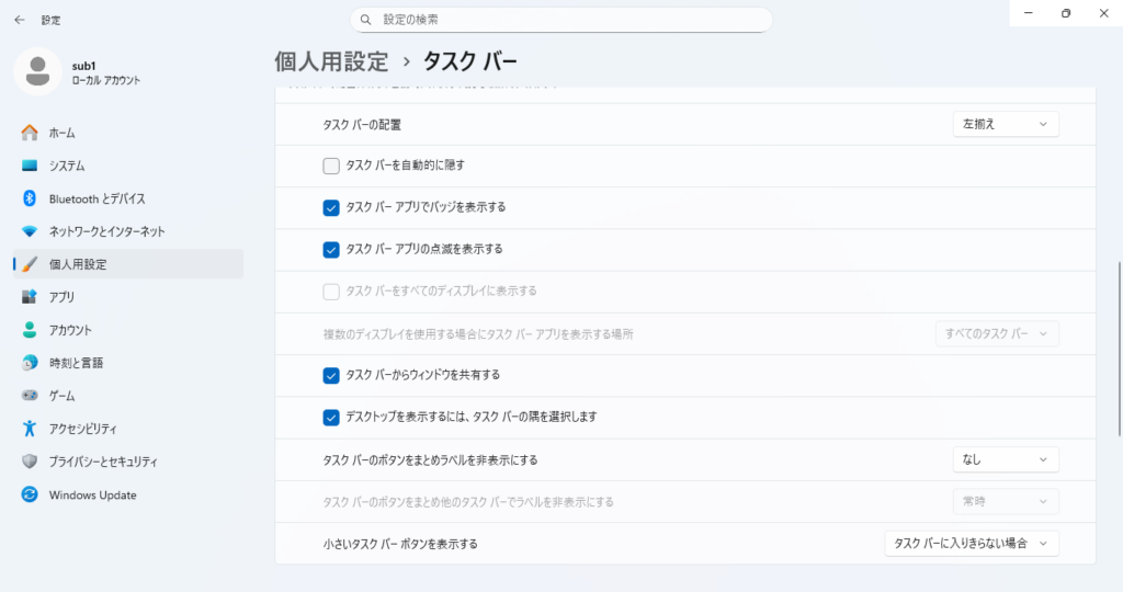 タスクバーのボタンをまとめラベルを非表示にする:なし