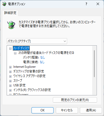 ハードディスク→次の時間が経過後ハードディスクの電源を切る:なし