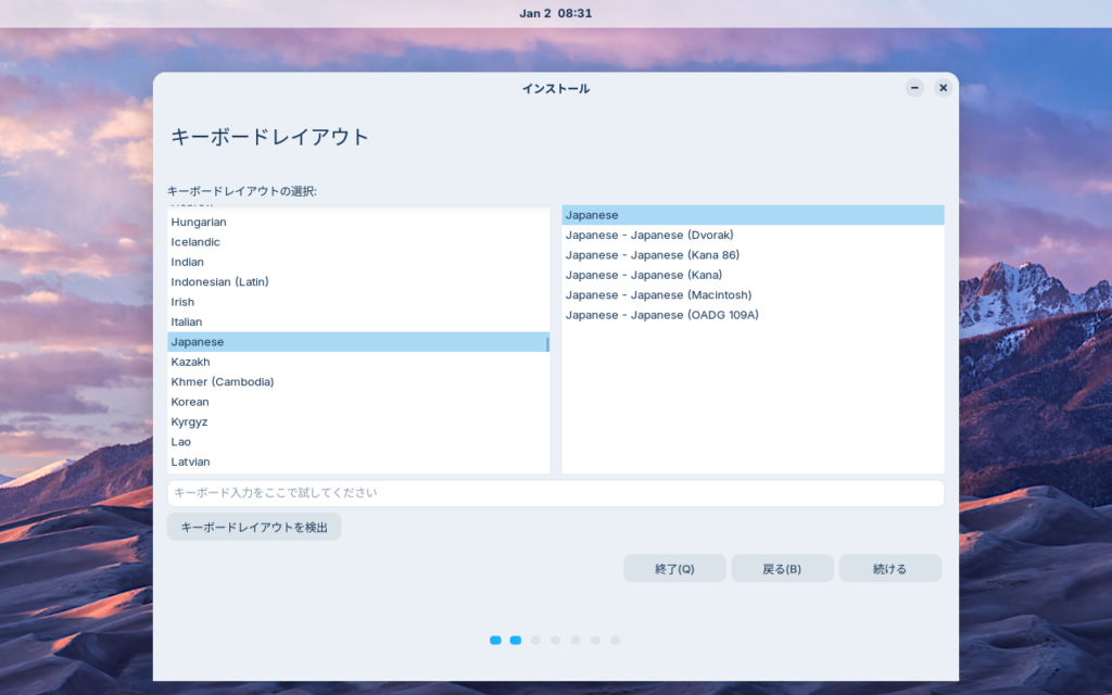 キーボードレイアウトはデフォルトでJapaneseが選択されているので、続ける、を選択