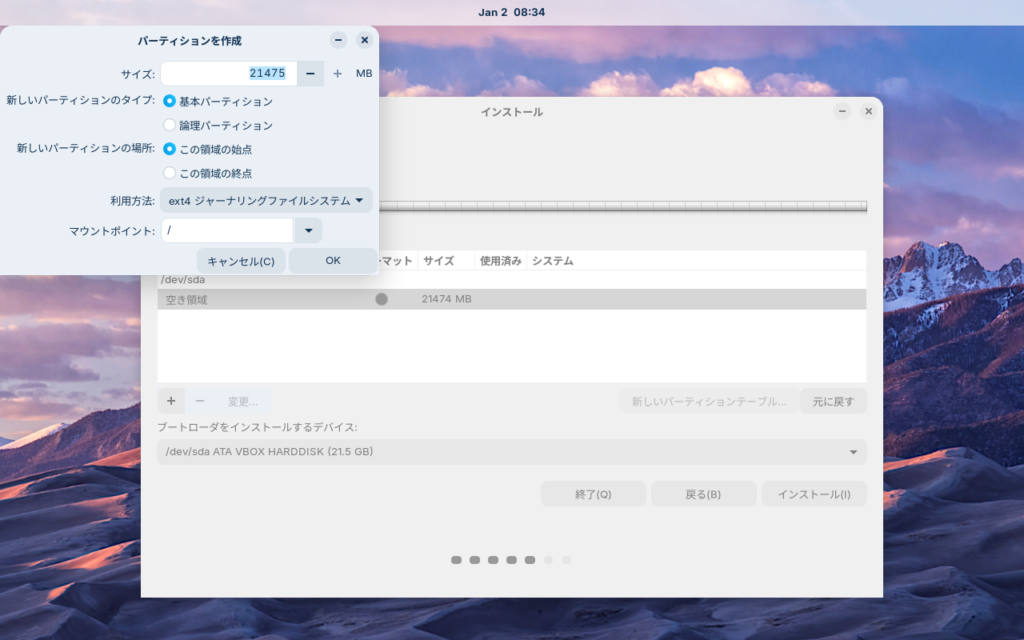 サイズが合っていることを確認し、マウントポイントは “/” を選択して、OKを選択